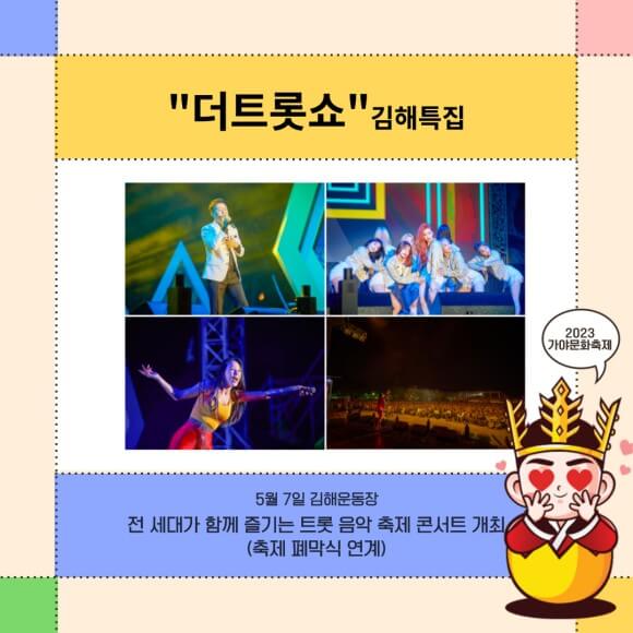 축제 마지막날인 폐막식과 함께 진행되는 "더트롯쇼 김해특집" 공연입니다. 생방송으로 진행되는 만큼 홍보도 상당한데요.