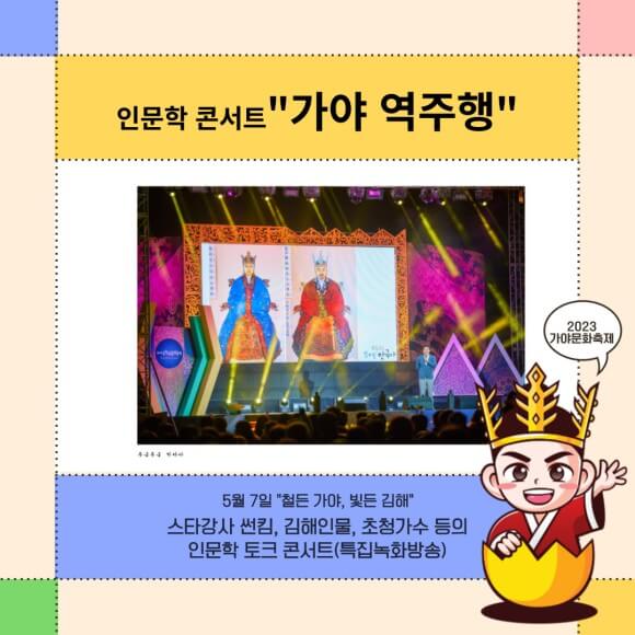 가야사 토크콘서트 "가야 역주행은" 가야역사를 알리는 토크, 공연 콘서트입니다. 인문학 스타강사 "썬킴"이 출연해서 진행할 예정입니다. 초청가수도 오시고 콘서트자체를 특집녹화방송으로 진행된다고 합니다.