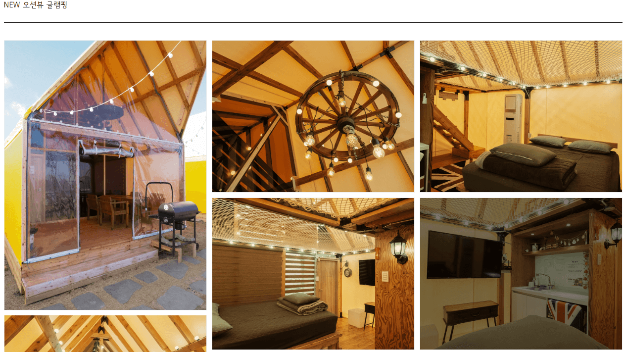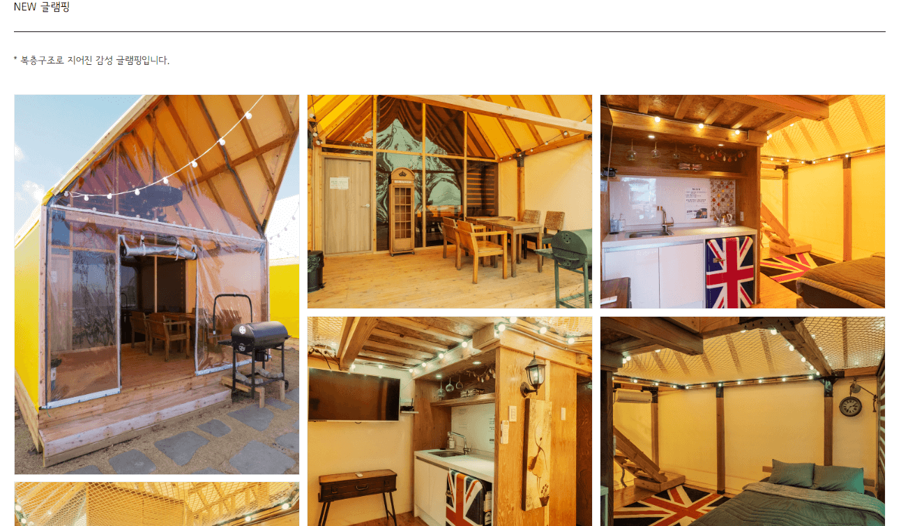 캠핑장에서 굳이 1박 2일이 아니더라고 제부도에는 SNS에서 입소문을 타고 유명해진 글램비 글램핑장이라고 있습니다. 6시간 동안 당일 글램핑이 가능한 이용권이 있으며, 이용시간은 당일패키지 기준 오후 3시 입실부터 오후 9시까지 6시간으로 제한이 되어있긴 합니다. 평일기준 88000원에 바베큐가 무한리필에 숯과 그릴 요금만 추가하면 10만원도 안되는 금액으로 글램핑을 이용하실 수 있습니다.
