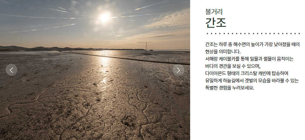 두 번째로 안내해 드릴 곳은 제부도 워터워크입니다. 밤이 되면 조명이 켜져서 인증샷남기기에도 소문난 장소입니다. 워낙 위치가 좋아서 똥손도 화려한 연출샷이 가능하다고 합니다. 하루 두 번씩 바닷물이 갈라지는 물길의 시작점부터 바다 위 44m 길이로 설치된 구조물이고, 밀물 때는 바다 위를 산책하는 기분으로 물의 흐름을 감상할 수 있고, 썰물 땐 드러나는 갯벌과 함께 제부도 전체 풍경을 조망할 수 있는 플랫폼으로 디자인되었다고 합니다.