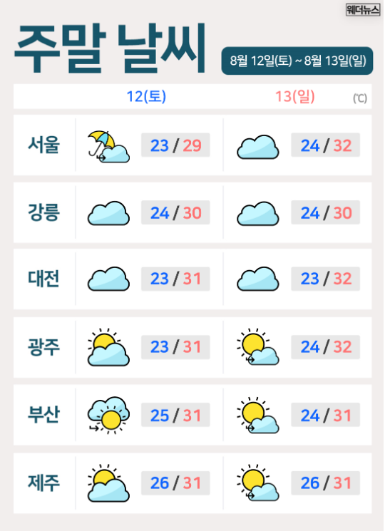 12일(토) 중부지방은 제 6호 태풍'카눈'에서 약화된 열대저압부의 영향으로 종일 흐리겠고, 수도권 지역은 새벽까지 비가 내리는 곳이 있습니다. 그 밖의 남부지방과 제주도는 북태평양 고기앞의 가장자리에서 구름만 많겠습니다. 13일(일)에는 전국이 북태평양 고기압의 가장자리에 들면서 전국이 가끔 구름이 많겠으나 수도권과 강원도는 대체로 흐리겠습니다. 주말 동안 아침 기온은 21~25도, 낮 기온은 27~33도로 태풍 전만큼 폭염이나 열대야가 심하진 않을 것으로 예상되어, 간만에 여름휴가와 나들이 떠나기 좋은 날씨를 보이겠습니다.