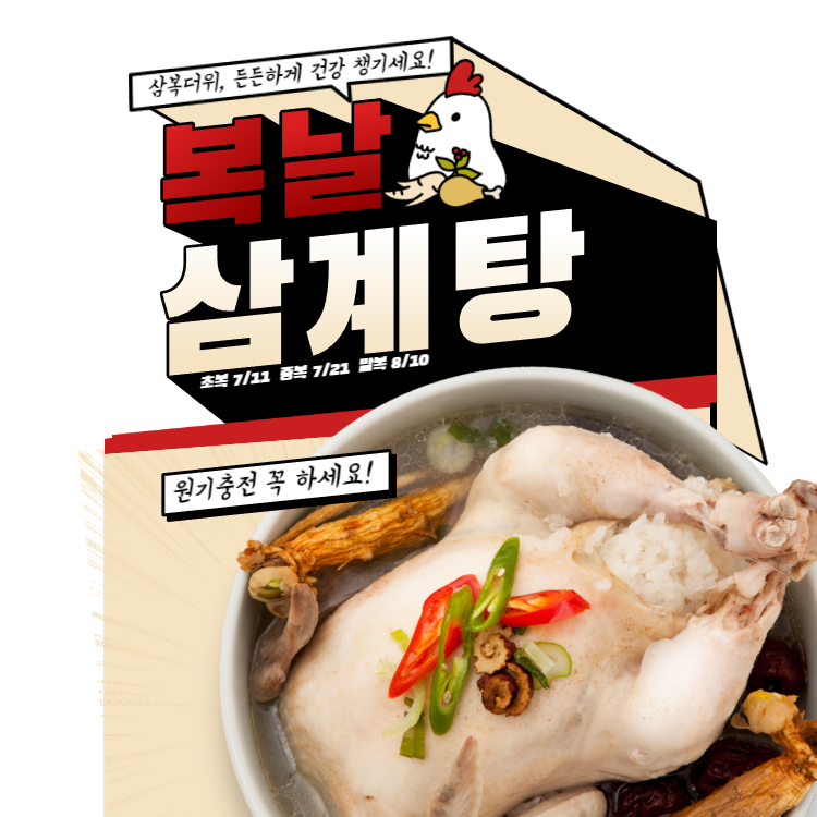 - 어느덧 올해의 초복이 오네요. 바쁘게 보낸 시간만큼 행복하셨으면 좋겠습니다. 날씨도 점점 더워지는데 초복에는 보양식 꼭 드시고 남은 여름도 힘차게 보내셨으면 좋겠습니다.