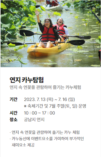 연꽃화원에 피어난 사랑 이야기를 간직한 스물 한살 연꽃화원에서 펼쳐지는 형형색색의 야간경관과 다채로운 공연무대, 밤에는 일곱가지 테마의 연꽃정원을 중심으로 펼쳐지는 환상적인 빛의 향연과 낮에는 10만여평 연지에 피어난 천만송이 연꽃과 함께 지역문화예술인의 수준 높은 공연과 각종 체험 및 이벤트 프로그램이 운영됩니다.