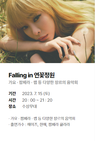 | 20:00 ~ 21:00 | Falling in 연꽃정원 - 헤이즈, 한해, 팝페라 클라라 |
