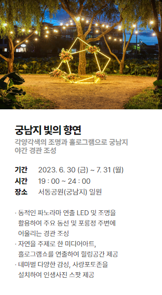◈ [궁남지 빛의 향연] 점등퍼포먼스 운영은 6월 30일(금) ~ 7월 31일(월) 한달동안 운영됩니다.
