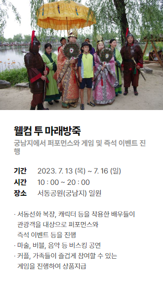 궁남지에서 즉흥적으로 하는 이벤트와 시가지에서 하는 퍼포먼스 안내입니다.